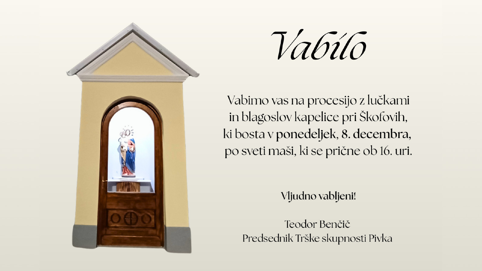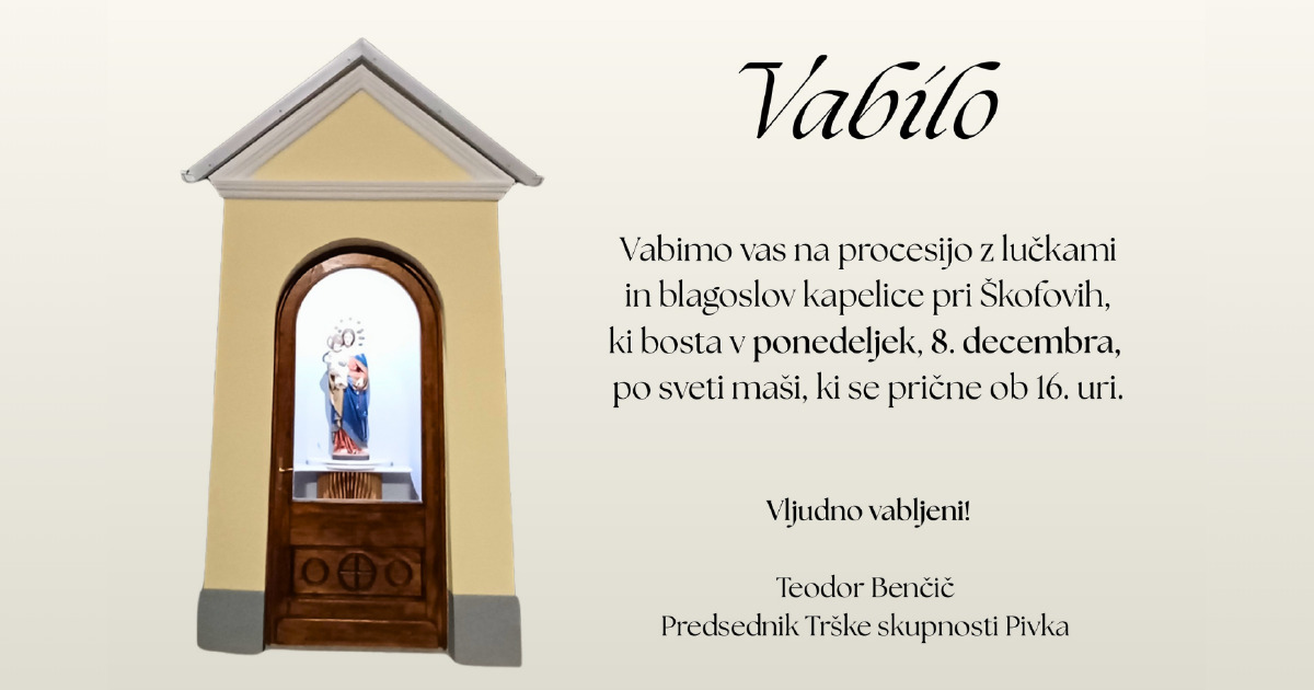 Trška skupnost Pivka vabi na procesijo z lučkami in blagoslov kapelice pri Škofovih, ki bosta v ponedeljek, 8. decembra, po sveti maši, ki se prične ob 16.00 uri. Vljudno vabljeni!