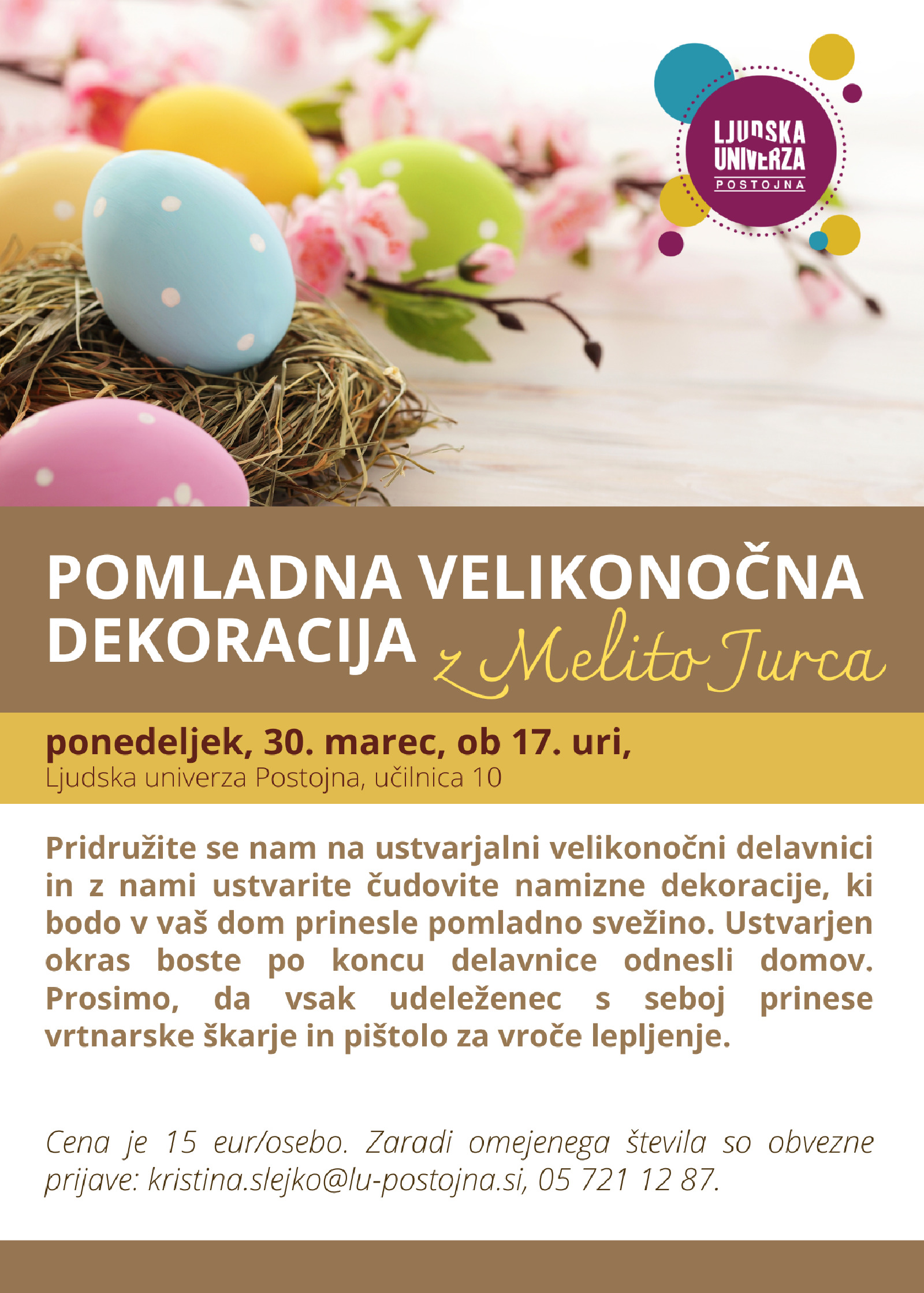 Vabimo vas na spomladansko ustvarjalno delavnico, kjer bomo skupaj izdelovali namizno velikonočno dekoracijo. V prijetnem in sproščenem vzdušju bomo spoznavali različne tehnike ter ustvarili unikatne velikonočne okraske.